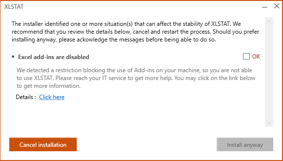 If you get this warning message when installing XLSTAT: