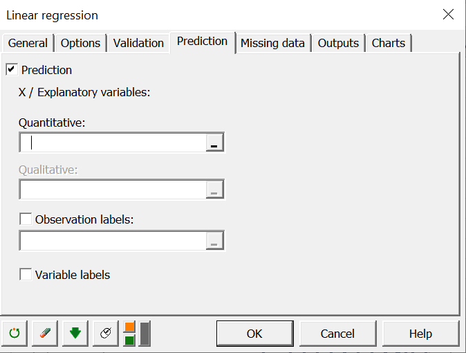 Once a linear regression equation is set, it can be used to forecast values of the dependent variable according to new values of the independent variables, which can be real or inspired by a scenario. For instance, revenues can be forecast using hypothetical scenarios involving specific values of stock prices or marketing investments. In order to obtain regression forecasts in XLSTAT, use the Prediction tab in the linear regression dialog box.