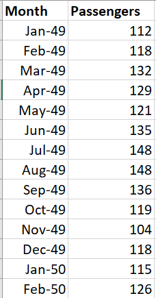 Below is an example of monthly international passenger data (in thousands) from at the San Francisco airport from January 1949 until December 1960. Data are taken from [Box, G. E. P., Jenkins, G. M. and Reinsel, G. C. (1976) Time Series Analysis, Forecasting and Control. Third Edition. Holden-Day. Series G].