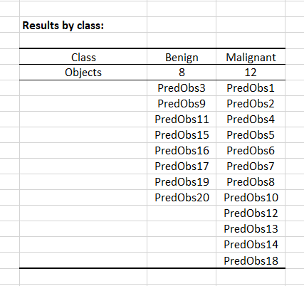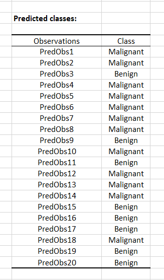 The model, regarding the data, predicts that: - The observations 3, 9, 11, 15, 16, 17, 19, 20 have a Benign cancer.