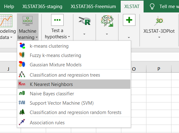 After opening XLSTAT, select the XLSTAT / Machine Learning / K nearest Neighbors command.