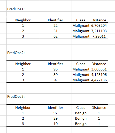 After that, for each tracked observation, the classes of the neighbors and their respective distances to the tracked observation is summarized in the following table. Below, we show the tracking information corresponding to the first three observations: