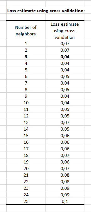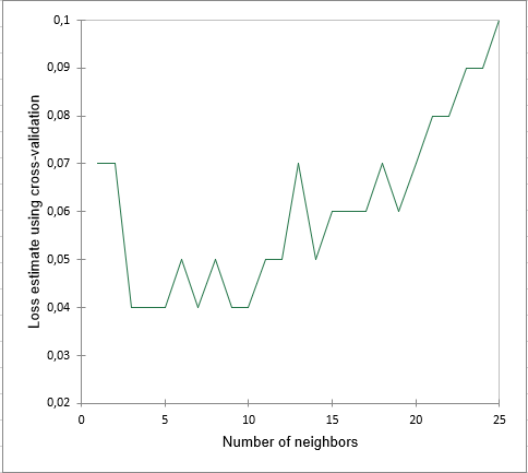 The next tab gives the prediction errors estimated through cross validation for each number of neighbors between upper and lower bounds, with his associated chart.