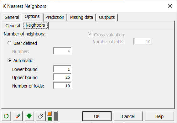 In the Neighbors tab, we can select manually the number of neighbors (User defined) or automatically (Automatic), the last one determines the optimal number in a range of value.