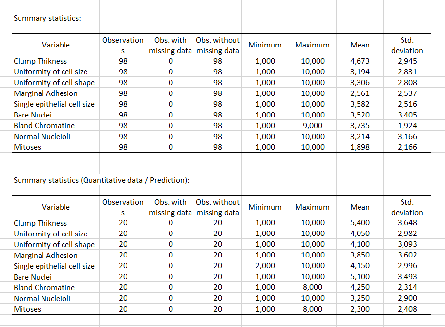 The goal of this tutorial is to use the K nearest Neighbors (KNN) classification method to determine whether a mammery tissue is benign or malignant. We will use the 100 first observations as a learning dataset, and the 20 last observations as a prediction data set. Thus, cancer class was removed on purpose in the 20 last observations.