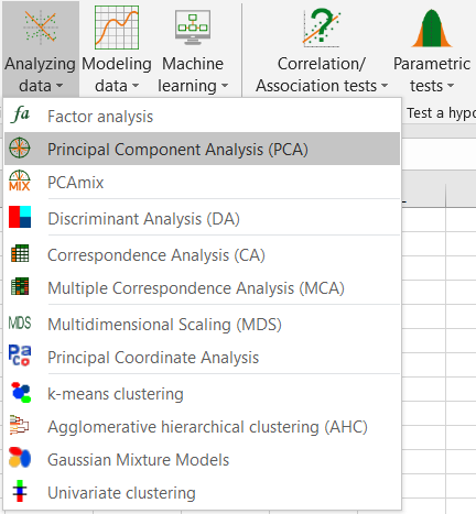 Once XLSTAT is activated, select the XLSTAT / Analyzing data / Principal components analysis command (see below).