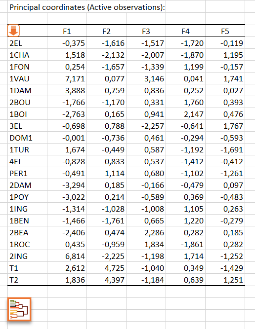 You can also launch an AHC by clicking on the button below the table of principal coordinates. An orange arrow allows you to go directly to the end of the table if it contains many variables.