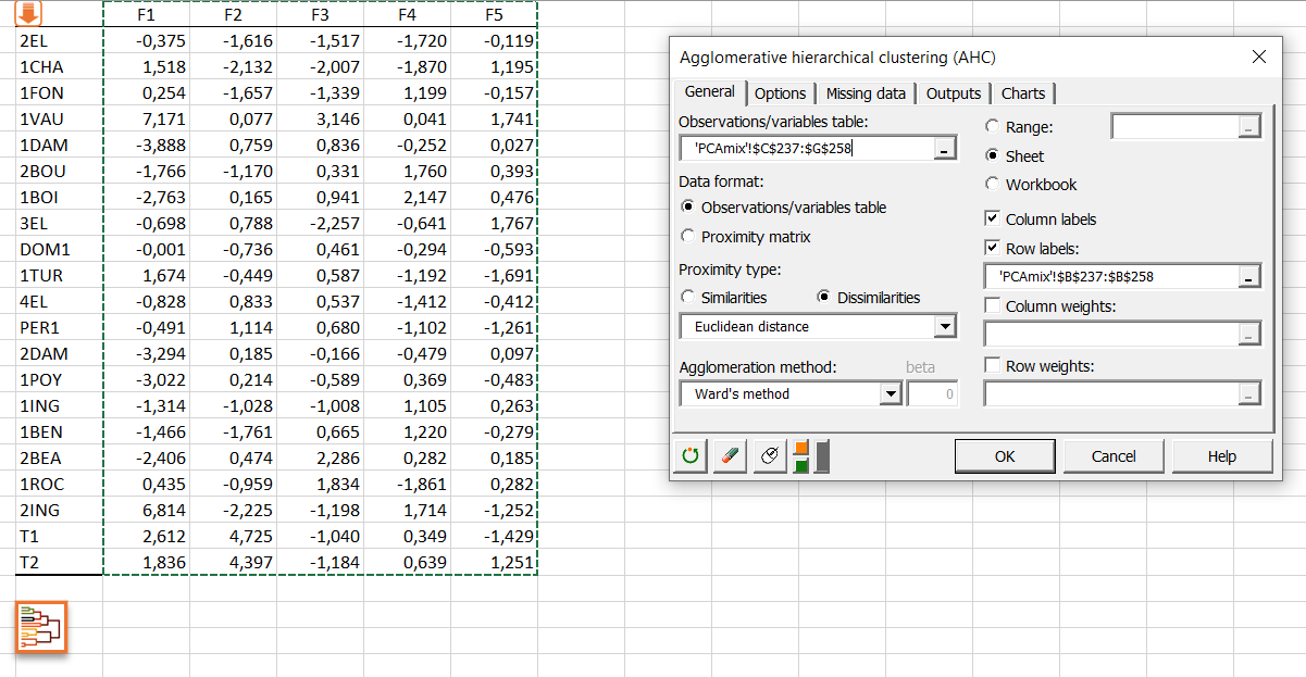Select columns D-P in the Observations/quantitative variables field and columns B-C in the Observations/qualitative variables field. The Variable labels option is left activated as the first row of the table contains the name of the variables. Then select column A in the Observations labels field.