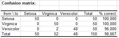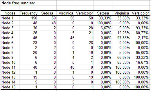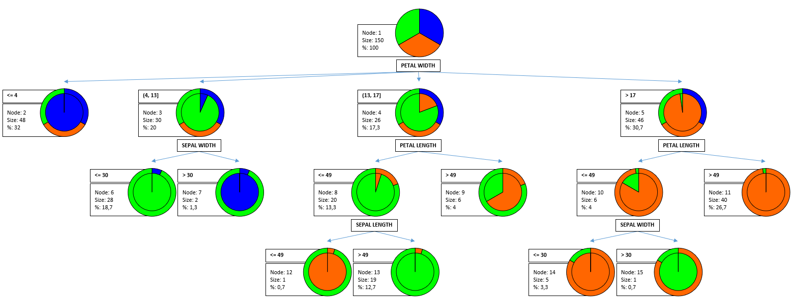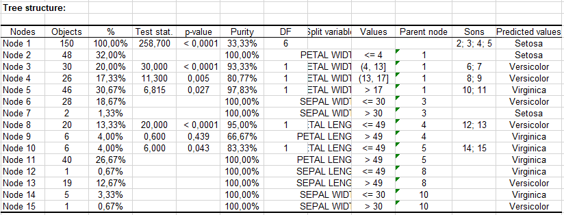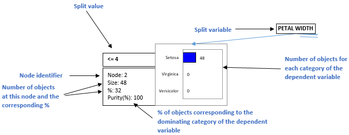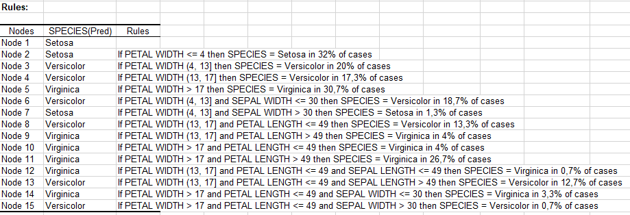 We can see that "If PETAL WIDTH <= 4 then SPECIES = Setosa in 32% of cases" this rule allow us to get node 2 and is checked for 45 flowers (32% of the data set) with a node purity of 100% as shown in the Tree structure table. So we have all the observations of this node which are correctly classified.