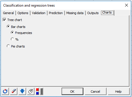XLSTAT offers a second possibility to visualize the classification trees. Instead of using bar charts, it uses pie charts. The latter is easier to read when they are many nodes and many categories for the dependent variable. The inner circle of the pie corresponds to the relative frequencies of the categories to which the objects contained in the node correspond. The outer ring shows the distribution of the categories at the parent node.