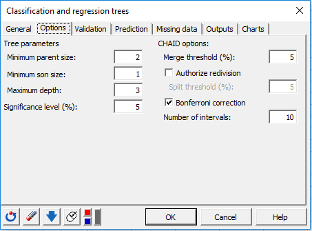 In the Options tab, we set the maximum tree depth to 3 to avoid obtaining a too complex tree. Several technical options allow to better control the way the tree is built.