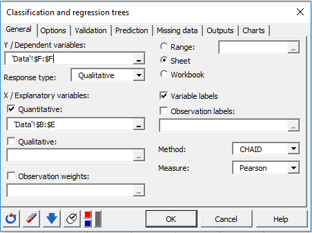 Select the qualitative dependent variable. In our case, this is the column "Species". The quantitative Explanatory variables are the four descriptive variables. We choose to use the CHAID algorithm to build the tree. Select the Variable labels to consider the variables names provided in the first row of the data set.