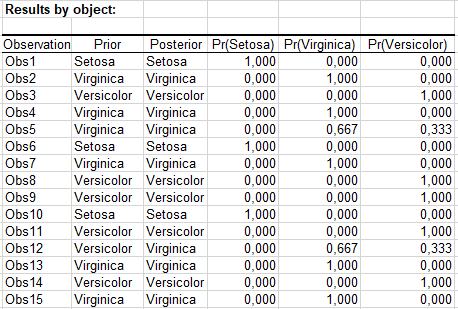 The rules that correspond to the leaves of the tree (the terminal nodes) allow to compute predictions for each observation, with a probability that depends on the distribution of the categories at the leaf level. These results are displayed in the "Results by object" table.