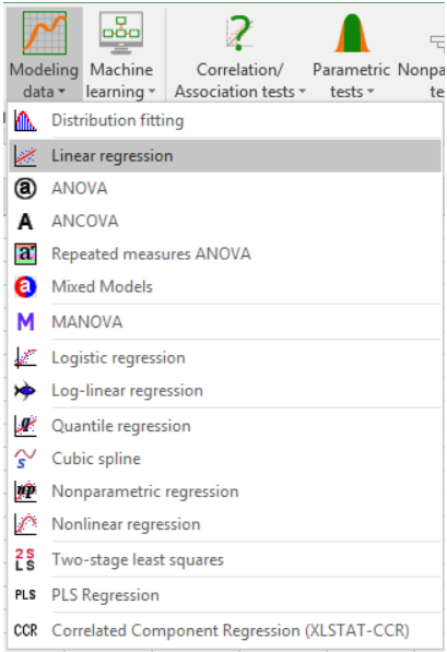After opening XLSTAT, select the XLSTAT / Modeling data / linear Regression command, or click on the corresponding button of the Modeling Data toolbar (see below).