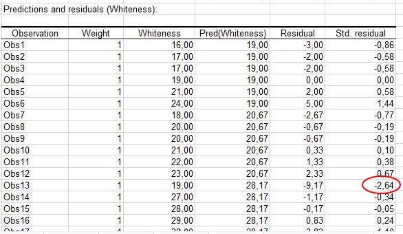The next table shows the residuals. We can look at the reduced residuals (standardized residuals) more specifically, residuals which, given the assumptions of the ANOVA model, should be normally distributed. This means, among other things, that 95% of the residuals should be in the interval [-1.96, 1.96].