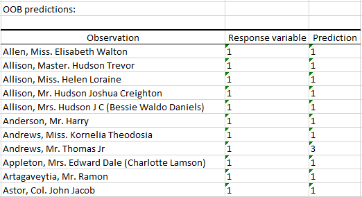 The second table displays the predicted class for each observation of the training set when the latter is Out-Of-Bag.