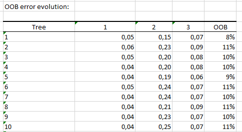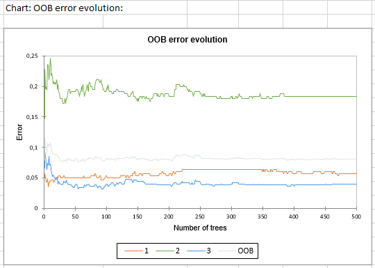 The last table presents the evolution of the OOB error rates according to the number of trees. The i-th element being the OOB error for all trees up to the i-th.