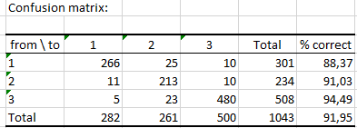 The next table displays the confusion matrix. That matrix tells us how well our classifier performed (predictions based on Out-Of-Bag data). Here, the algorithm predicted correctly 94.92% of observed classes.