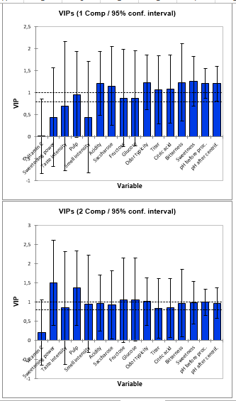 The following table displays the VIPs (Variable Importance for the Projection) for each explanatory variable, for an increasing number of components. This allows to quickly identify which are the explanatory variables that contribute the most to the models. For the model with one component, we can see that the Vitamin C, the Sweetening power, the Odor intensity and the Taste intensity have a low influence on the models.