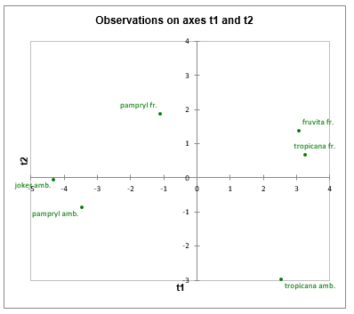 Two tables giving results for the u and u~ components are then displayed. A chart allows visualizing the observations (in our case the juices) in the space of the u~.