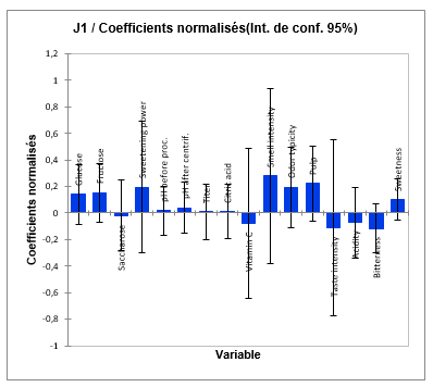 We have performed a new Partial Least Squares regression analysis, using just J1 as a dependent variable, and forcing the number of components (see the options tab) to 2. The results are displayed on the PLS2 sheet. We can now see that the quality of the results has been improved. The following chart corresponds to the standardized coefficients of the new model.