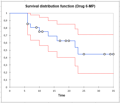 Last, the comparison of the two survival curves allows us to conclude to confirm that the drug significantly improves survival time of patients.