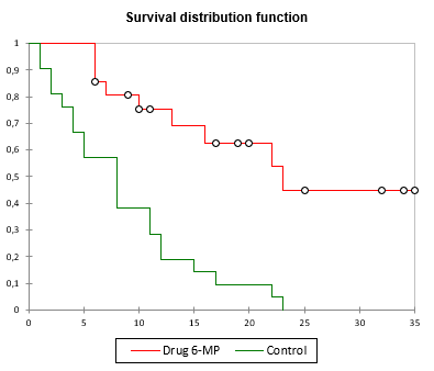 Our goal is to determine if and how the drug influences the survival time, by comparing the survival curves for two groups of 21 patients, the first being treated, and the second being a control group. All 21 patients of the control group were observed to have a recurrence of their leukemia. Only 9 of the 6-MP patients had an observed recurrence time, while the 12 others were censored.