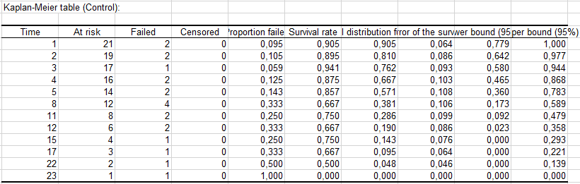 First, the Kaplan-Meier table is displayed. It contains the results of the Kaplan-Meier analysis with several key indicators such as the Survival distribution function.