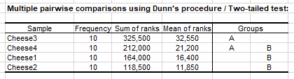 The first table displays the Kruskal-Waliis K statistic and the corresponding p-value. The p-value tells us that the probability of rejecting the null hypothesis although it is correct is about 0.0005. We conclude that we can securely reject the null hypothesis that there is no difference between the cheeses.