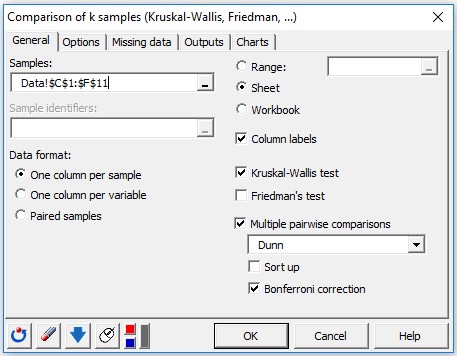 Then select the Dunn test in the Multiple comparisons and activate the Bonferroni option, so that if the hypothesis that the cheeses are the same is rejected, we may identify which cheeses are different.