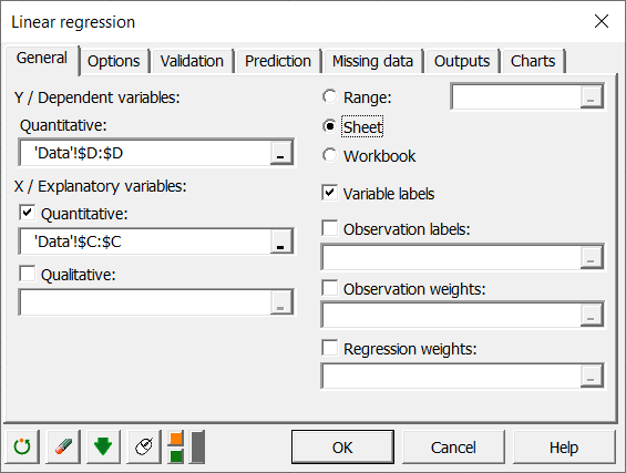 Once you've clicked on the button, the Linear Regression dialog box will appear.