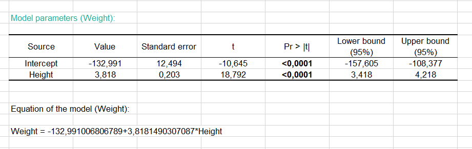 The equation of the model is written below the table. We can see that in the range of the variable Height that is taken into account here, when the Height increases by one inch, the Weight increases by 3.8 pounds.