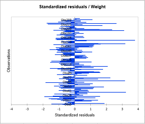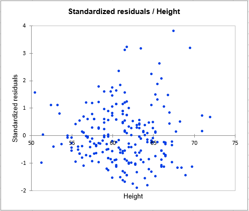 The third chart (see below) allows us to visualize the standardized residuals versus the Height. It is not the case here, but when plotting the residuals against the explanatory variable, if a trend is identified, this indicates that the model is not correct of there is an autocorrelation in the residuals, which is contrary to one of the assumptions of parametric linear regression.