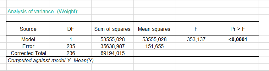 In this particular case, 60 % of the variability of the Weight is explained by the Height. The remainder of the variability is due to some effects (other explanatory variables) that have not been included in this analysis.
