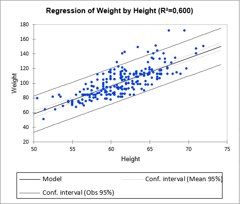 The first chart (see below) allows us to visualize the data, the regression line (the fitted model), and two confidence intervals: the confidence interval on mean of the prediction for a given value of the Height is the one closer to the line.