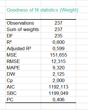 The conclusion is that the Height allows us to explain 60 % of the variability of the Weight. A significant amount of information is not explained by the model we have used. In a tutorial on Multiple Linear Regression, the Age variable is added to the model to improve the quality of the fit.