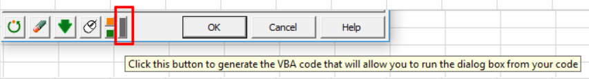 Click on the grey button at the bottom left of the dialog box: Click this button to generate the VBA code that will allow you to run the dialog box from your code.