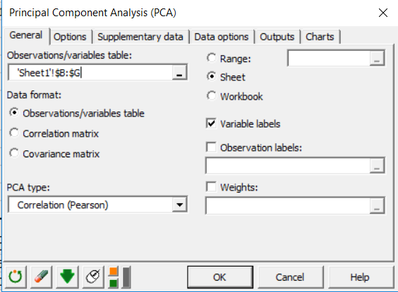 - Observation labels: ticked and select the column A for the sample name