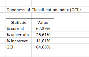Finally, the last table indicates that 62.39% of the observations were well classified (true positives), 26.61% had an uncertain classification and 11.01% were misclassified (false positives and false negatives). The GCI (Goodness of Classification Index) is 64.68%, which means that the predictive quality of this classification model is satisfactory.