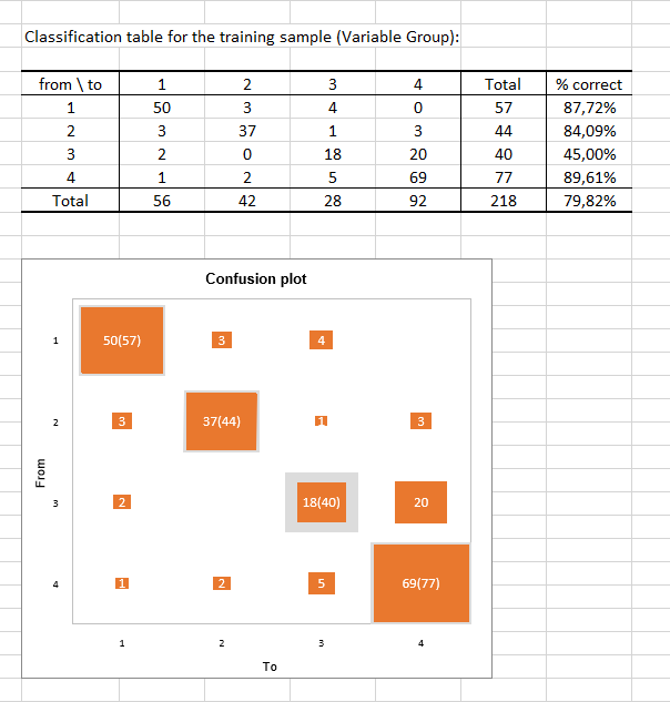 The classification table for the training sample (also called the confusion matrix) shows the percentage of observations that are well classified for each modality (true positives and true negatives). For example, the observations of modalities 1, 2 and 4 were respectively well classified at 87.72%, 84.09% and 89.61% while the observations of modality 3 were well classified for only 45% of the cases.