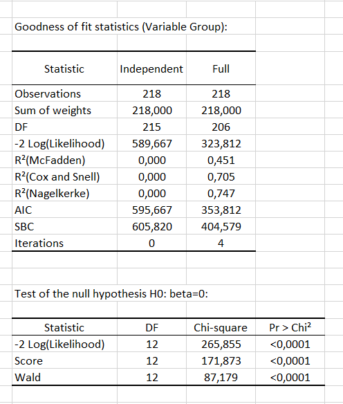 The goodness-of-fit statistics table gives several indicators of the quality of the model. These results are equivalent to the R² in linear regression and to the ANOVA table. The most important value is the Chi² associated with the Log ratio (L.R.). It is the equivalent of Fisher's F-test of the linear model: we try to evaluate if the variables provide a significant amount of information to explain the variability of the response variable. In our case, as the probability is lower than 0.0001, we may conclude that the variables bring a significant amount of information.