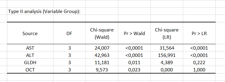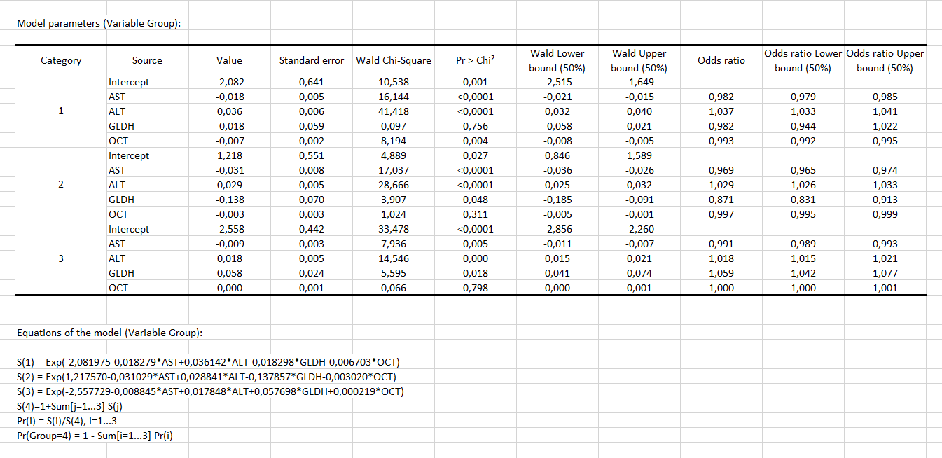 The table of model parameters then allows us to test not each variable globally, but its influence on each of the modalities in comparison with the reference one (here 4). Thus, we see that compared to the reference modality, modalities 2 and 3 are influenced by the GLDH variable, because the coefficient is significant (respectively 0.048 and 0.018), which is not the case for modality 1 (0.756). In addition, having a high GLDH value influences having a higher chance of having disease 3 compared to 4 (as the coefficient is positive, 0.058, and the pvalue significant, 0.018).