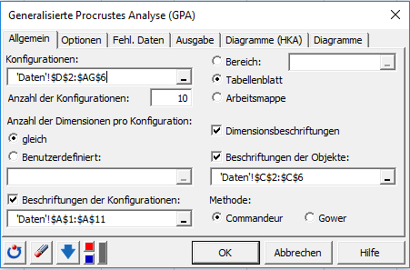 Nach dem Klicken des Buttons, erscheint das Dialogfenster. Wählen Sie nun die Daten, die den Konfigurationen entsprechen (eine Konfiguration entspricht hier einem Satz von Bewertungen eines Experten). Die Anzahl der Konfigurationen muss eingegeben werden. Das wir 10 Experten haben, geben wir 10 ein. Da jeder Experte 3 Bewertungen für jede der drei Dimensionen gab, können wir XLSTAT mitteilen, dass die Anzahl der Dimensionen konstant ist, dem die „gleich“ Option aktiviert wird. Falls die Anzahl der Dimensionen verschieden für mindestens eine der Konfigurationen ist, so müssen Sie eine Spalte mit der Anzahl an Dimensionen für jede der Konfigurationen.