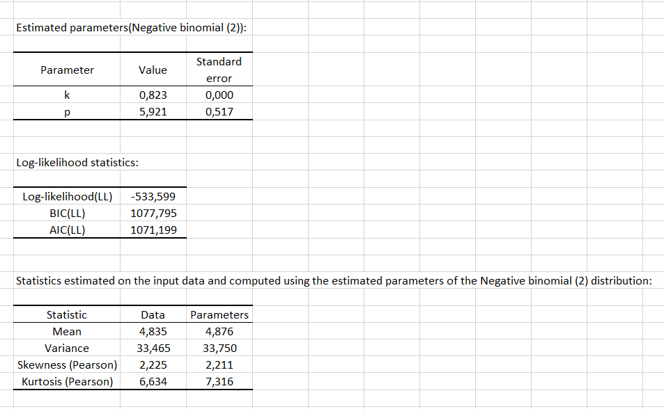 The first result of interest for us is the value of the k and p parameters of the negative binomial distribution (fitted using the maximum likelihood method), and the estimates of the sample and theoretical mean, variance, skewness and kurtosis. The closer these statistics obtained from the data and from the parameters, the better the fit. Here, the fit is excellent. Note: the theoretical mean is given by kp, and the variance by kp(p+1).