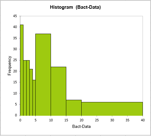 The data correspond to an experiment where 200 samples of water from a river were cultured on medium with nutrients to determine the presence or absence of bacterial contamination with Escherichia coli. The number of colonies has been counted after 72 hours of incubation. In the Bact-Data column you will find the counts for the 200 samples.