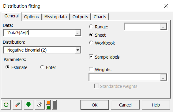 In the General tab, select column B in the Data field. We let XLSTAT estimate the parameters of the negative binomial distribution function. XLSTAT offers two different formulations of the negative binomial distribution. The one that is adapted to our case is the second one.
