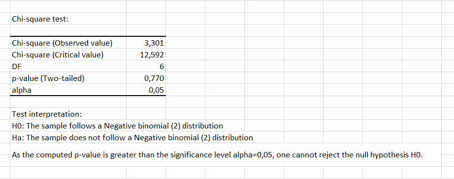 As we are satisfied by this result, we can now use the distribution fitting tool to test if the sample follows a negative binomial distribution.