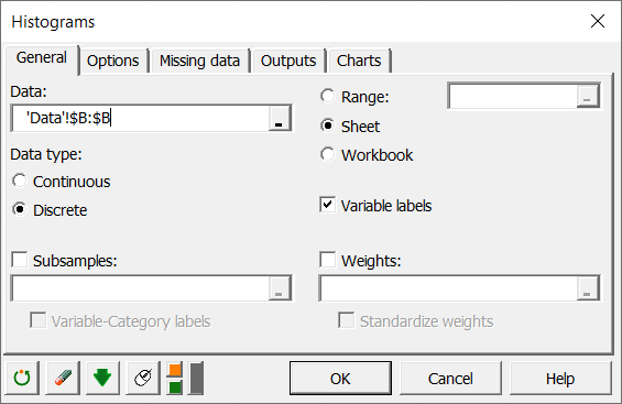 The dialog box then appears. Select the data on the Excel sheet named Data. In the general tab, select column B in the Data field. We activate the discrete option because the counts are discrete values. The Sample labels option is left activated because the first row of the data selection contains the name of the sample.
