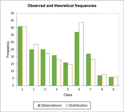 The Chi-square goodness of fit test allows to test if the Chi-square distance between the empirical and theoretical distribution functions is above a critical value or not. A visual comparison between the observed and theoretical frequencies is available on the next figure.