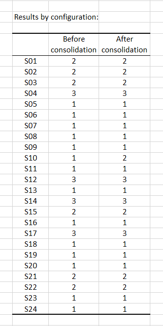 The following table shows the classes of the different configurations before and after consolidation. It appears that only subject 10 changed class with the consolidation.